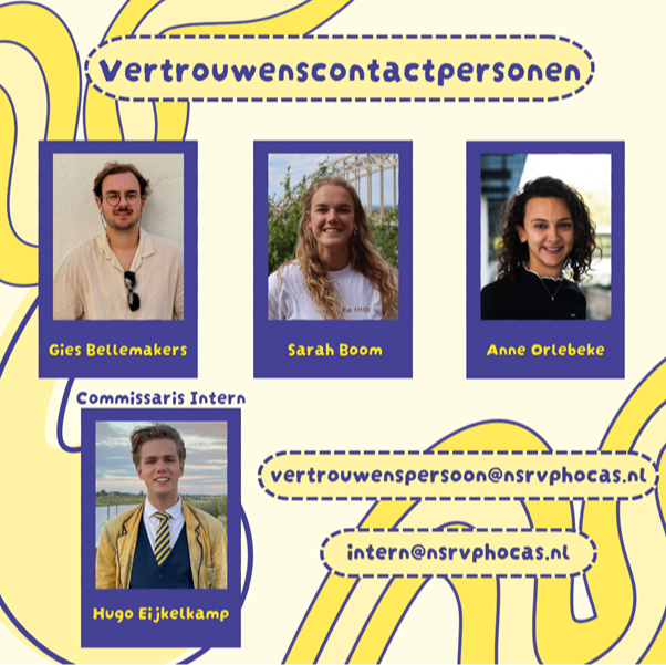 Onze vertrouwenscontactpersonen Gies Bellemakers, Sarah Boom en Anne Orlebeke zijn binnen onze vereniging zeer actief (geweest). Zij kunnen je adviseren over zaken binnen de vereniging, maar ook een luisterend oor bieden.
